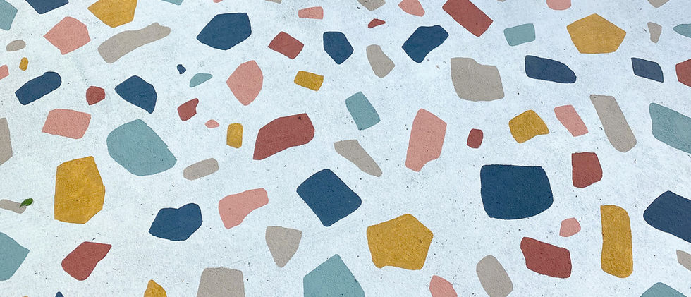 Personal Project. Revamped my back patio with a fun terrazzo style pattern mural which was done freehand and no stencil used. Paint over concrete pad. Also created a DIY table using a pallet and concrete pavers for the table legs.